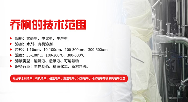 上海喬楓實業(yè)有限公司,成立于2012年,是從事噴霧干燥設備的研發(fā)設計、生產、銷售(小型噴霧干燥機實驗型噴霧干燥機,35℃低溫噴霧干燥機,有機溶劑噴霧干燥機,低溫閉式循環(huán)噴霧干燥機超細粉末噴霧干燥機、噴霧冷凍干燥機、真空噴霧干燥機、氣流噴霧干燥機,噴霧造粒干燥機,離心噴霧干燥機,沸騰制粒機等)和售后于一體的綜合性公司,本公司現成為一家致力于為生物制藥、精細化工、新能源、陶瓷造粒及食品工程等領域提供全套解決方案的整線交鑰匙工程企業(yè)。